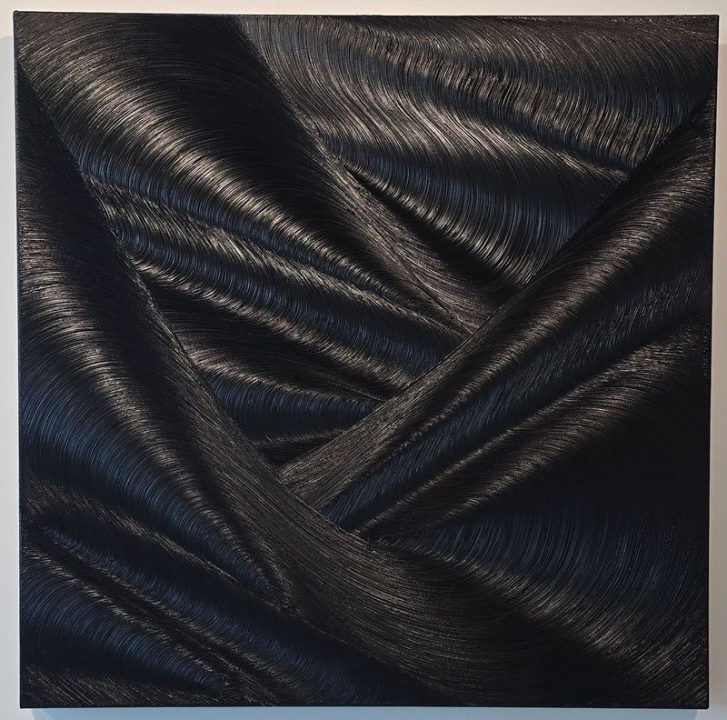 Loin d’être une simple absence de couleur, le noir devient, sous son pinceau, un espace en perpétuelle métamorphose. Ses toiles captent la lumière, la restituent et la transforment, révélant une infinité de nuances, de reflets et de textures. Chaque pli, chaque courbure façonne une profondeur qui attire le regard et invite à une exploration sensorielle. Ce jeu subtil entre ombre et éclat confère à ses œuvres une présence hypnotique, presque vivante.